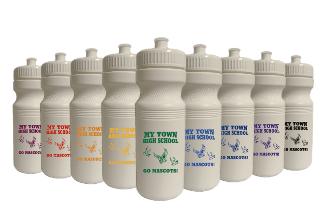 Our Sports Bottles are white with the schools’ name, mascot and logo printed on one side and the business ad printed on the other side. Both sides are printed in the schools’ primary color.